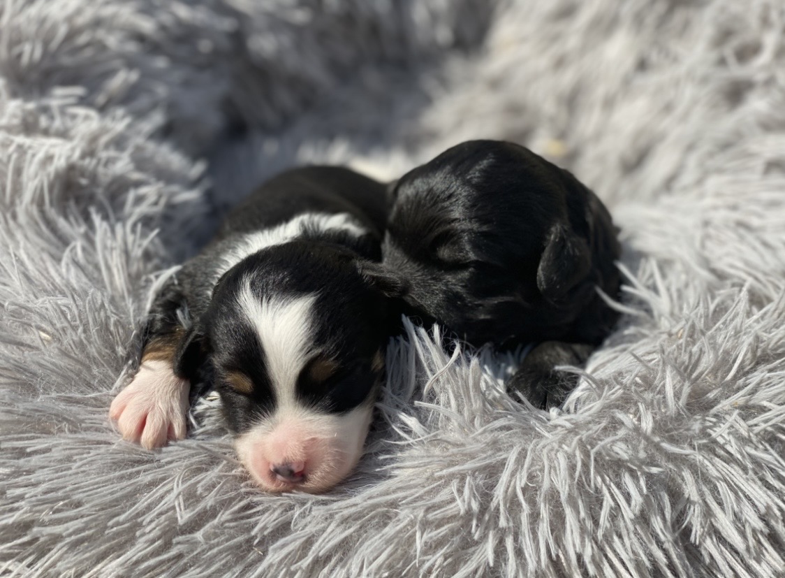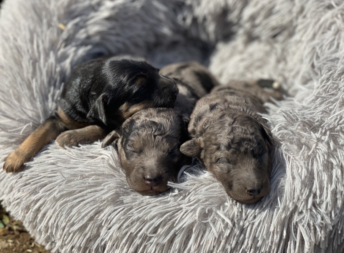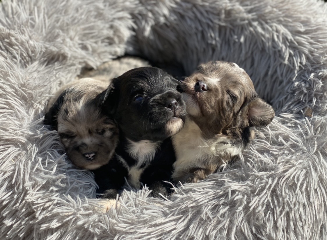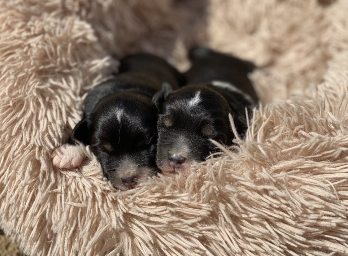 Voici les chiots aussiedoodles F1b de Sidonie et Tango, mâles et femelles, nés le 7 avril 2026, prêts à rejoindre leur nouvelle famille dès le début du mois de juin. À l’âge adulte, ils feront environ 35 à 40 cm au garrot et pèseront entre 8 et 12 kg.