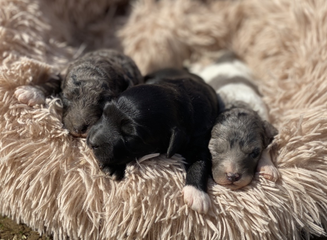 Chiots aussiedoodles F1 de Scala et Saphir, nés le 8 avril 2026, également disponibles pour début juin. À l’âge adulte, ils mesureront environ 35 à 40 cm au garrot pour un poids situé entre 8 et 12 kg.